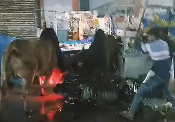 દ્વારકાની માર્કેટ ચોક પાસે આખલાઓના યુદ્ધમાં બાઇક, ફ્રૂટલારીનું કચ્ચરધાણ