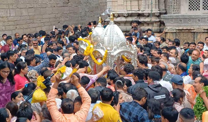 શરણાઈ અને બેન્ડવાજાના તાલે ધાર્મિક ભજનો સાથે ઠાકોરજીના બાલ સ્વરૂપને ચાંદીના રથમાં મંદિર પટાગણમાં ચાર પરીક્રમા કરાવાઇ યાત્રાધામ દ્વારકા જગત મંદિર ખાતે અષાઢી બીજ નિમીતે…