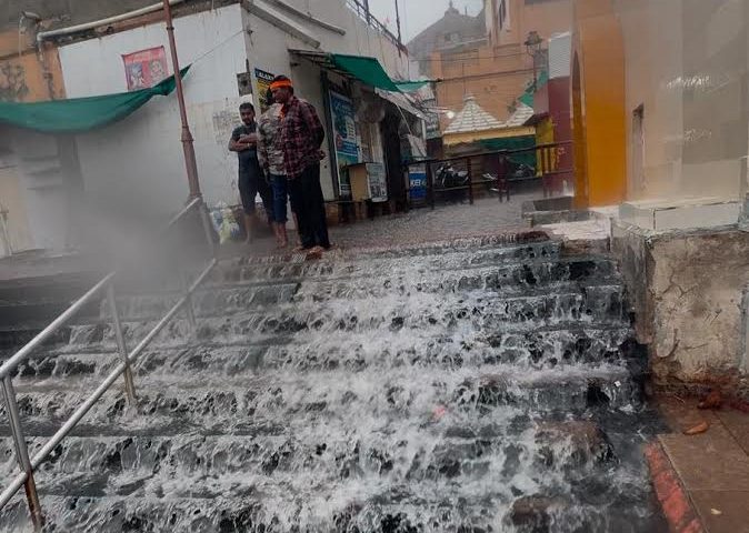 યાત્રાધામ દ્વારકામાં શનિવારે સવારે વરસતા વરસાદમાં જગત મંદિરના સ્વર્ગ દ્વાર 56 સીડી પરથી વરસાદી પાણી ઝરણાંની જેમ પગથિયા ઉપરથી પાણી વહેતા થતા અદભુત દ્રશ્યો જોવા…