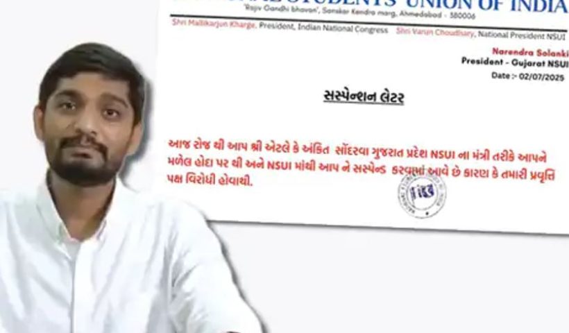 ગુજરાત પ્રદેશ NSUIના પ્રમુખ નરેન્દ્ર સોલંકી દ્વારા મંત્રી અંકિત સોંદરવાને પક્ષ વિરોધી પ્રવૃત્તિઓ બદલ સસ્પેન્ડ કરવામાં આવ્યા છે. આ સસ્પેન્શન પાછળ પ્રાથમિક તબક્કે ભાજપ…