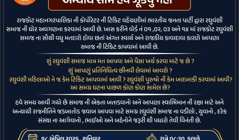 આગેવાનોને મનાવવા શહેર ભાજપ પ્રમુખની દોડધામ, શનિવારે ‘રઘુવંશી સ્વભિમાન સંમેલન’નું એલાન, વોર્ડ નં.1-2-3-14માં બહોળી સંખ્યામાં રઘુવંશી મતદારો ભાજપનો ‘ખેલ’ બગાડશે ? મહાનગરપાલિકાની ચૂંટણીને આડે ગણતરીના…