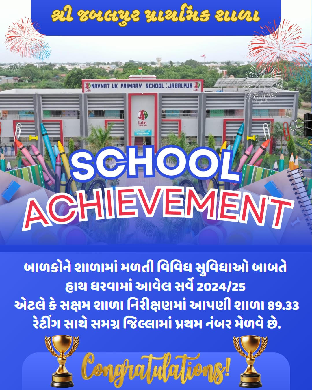 શ્રી જબલપુર પ્રાથમિક શાળાએ વધુ એક ગૌરવભરી સિદ્ધિ હાંસલ કરી છે. આ શાળાએ સરકાર દ્વારા વર્ષ 2024/25 માટે કરાયેલ સક્ષમ શાળા સર્વેક્ષણમાં 89.33 ટકા રેટિંગ મેળવી સમગ્ર જિલ્લામાં પ્રથમ ક્રમ મેળવ્યો છે. આ સર્વે શિક્ષણ વિભાગ દ્વારા બાળકને શાળામાં મળતી વિવિધ શૈક્ષણિક, સાંસ્કૃતિક અને ભૌતિક સુવિધાઓના આધાર પર કરવામાં આવે છે.