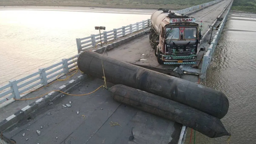 ગત 9 જુલાઈના રોજ પાદરા નજીકના મુંજપુર ખાતે આવેલ ગંભીરા બ્રિજ ધરાશાયી થયા બાદ તૂટેલા પુલ પર જોખમી રીતે લટકી રહેલા ટેન્કરને આખરે મરીન ઈમરજન્સીની ટીમ દ્વારા એરકેપ્સ્યુલના બલુનમાં હવા ભરીને સલામત જગ્યાએ લાવવામાં સફળતા સાંપડી છે. હકીકતમાં પાદરા-આણંદને જોડતા બ્રિજનો એકભાગ અચાનક તૂટી પડતાં ત્યાંથી પસાર થઈ રહેલું ટેન્કર જોખમી રીતે લટકી પડ્યું હતુ.