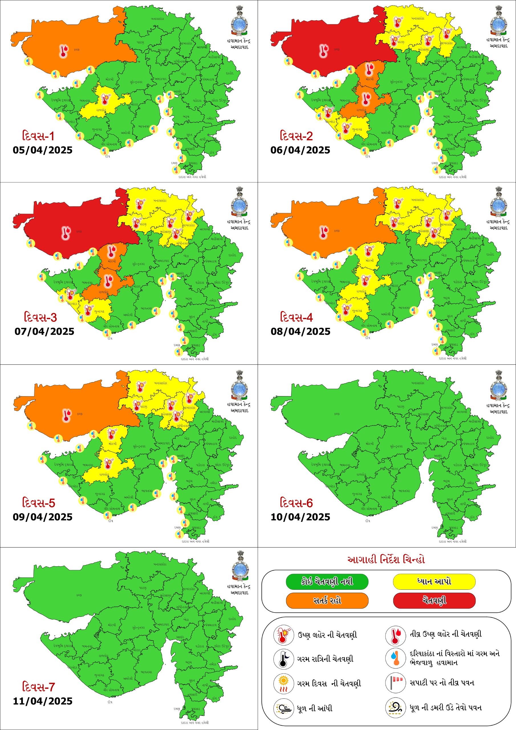 આ ઉપરાંત સોમવારે પણ કચ્છમાં રેડ, રાજકોટ-મોરબીમાં ઓરેન્જ અને બનાસકાંઠા-સાબરકાંઠા-પાટણ-મહેસાણા તથા ગાંધીનગરમાં યલો એલર્ટ અપાયું છે. તા. 8 અને 9મીએ કચ્છમાં ઓરેન્જ તેમજ રાજકોટ મોરબી સહિત આઠ જિલ્લામાં યલો એલર્ટ અપાયું છે. તા. 10 થી ગરમીમાં રાહત મળવાની આશા છે.