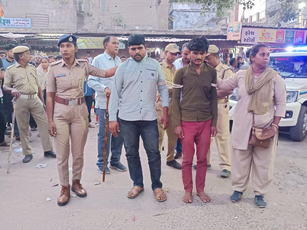 થાનગઢ નજીકનાં સારસાણા ની સીમમાં પ્રેમ પ્રકરણમાં ગત બુધવારનાં રોજ ત્રણ શખ્સો અને તેના સાગરીતો એ મળી નિદ્રાધીન પરિવાર ઉપર છરી, લાકડી વડે હુમલો કરી મહિલા સહિત ત્રણ વ્યક્તિ ની હત્યાં ના ગુના ના મુખ્ય બે આરોપીઓ ને રવિવારના પકડી પાડી પાડી જાહેરમાં સરભરા કરી હતી.