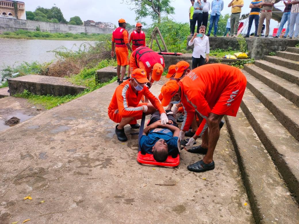 માનનીય કલેકટર સાહેબ રાજકોટની સૂચનાથી પ્રાંત અધિકારી સાહેબ ધોરાજીના માર્ગદર્શન નીચે મામલતદાર ઉપલેટા તથા ઉપલેટા તાલુકા વહીવટી તંત્ર દ્વારા મોકડ્રીલનું આયોજન કરવામાં આવેલ. જેમાં ઉપલેટા ખાતે મોજ નદીના કાંઠે આવેલ શ્રી સોમનાથ મહાદેવ મંદિર પાસેના મોજ નદીના ચેકડેમમાં ત્રણ યુવકો ડૂબ્યા હોવાના સમાચાર ઉપલેટા તાલુકા કંટ્રોલ રૂૂમમાં મળતા ઉપલેટા ખાતે રહેલ NDRF ટીમ, નગરપાલિકા કચેરી ઉપલેટાની ટીમ, મેડીકલ ટીમ, પોલીસ સ્ટેશન ઉપલેટાને જાણ કરતા તમામ લગત વિભાગો તાત્કાલિક સ્થળ પર પહોંચી NDRF ટીમ દ્વારા તથા સ્થાનિક વહીવટી તંત્ર દ્વારા હોડી, તરવૈયા, ડીપ ડાઈવીંગ ટીમની મદદથી ડૂબતા ત્રણેય યુવકોને સફળતાપૂર્વક રેસ્ક્યું ફરી મેડિકલ ટીમ મારફત સારવાર અપાવી. અંતે ઉપલેટા મામલતદાર નિખિલ મહેતા દ્વારા મોકડ્રીલ જાહેર કરવામાં આવી. આ મોકડ્રીલમાં મામલતદાર ઉપલેટા, તાલુકા વિકાસ અધિકારી ઉપલેટા, પોલીસ સબ ઇન્સ્પેક્ટર ઉપલેટા તથા તેમની ટીમ, આરોગ્ય વિભાગની ટીમ, નગરપાલિકા ઉપલેટાની ટીમ તથા NDRF ની ટીમ હાજર રહેલ.