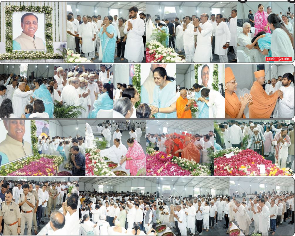 રાજકોટના પૂર્વ ધારાસભ્ય અને પૂર્વ મુખ્યમંત્રી સ્વ.વિજયભાઈ રૂપાણીની ગઈકાલે રેસકોર્ષ સંકુલમાં રમેશ પારેખ રંગભવન ખાતે યોજાયેલી પ્રાર્થનાસભામાં તમામ ક્ષેત્રના લોકોએ ઉપસ્થિત રહી સ્વ.વિજયભાઈ રૂપાણીને પુષ્પાંજલી અર્પણ કરી હતી. સ્વ.વિજયભાઈ રૂપાણીની પ્રાર્થનાસભામાં સૌરાષ્ટ્રભરમાંથી કાર્યકરો આગેવાનો મોટી સંખ્યામાં ઉમટી પડયા હતાં. આ પ્રસંગે દિલ્હીના પૂર્વ મુખ્યમંત્રી અરવિંદ કેજરીવાલે પણ પ્રાર્થનાસભામાં સ્વ.વિજયભાઈને પુષ્પાંજલી અર્પણ કરી અંજલિબેન રૂપાણી તથા તેના પુત્ર ઋષભ રૂપાણીને સાંત્વના પાઠવી હતી. ભાજપના સ્થાનિક નેતાઓ વજુભાઈ વાળા, સાંસદ પરસોતમભાઈ રૂપાલા, રામભાઈ મોકરિયા, ભાજપ કોંગ્રેસના ધારાસભ્યો, નેતાઓ, કાર્યકરો ઉપરાંત સંતો, મહંતો અને વ્યાપાર ઉદ્યોગ સહિત તમામ ક્ષેત્રના લોકો તથા અધિકારીઓ, કર્મચારીઓએ પણ સ્વ.વિજયભાઈ રૂપાણીને ભીની આંખે પુષ્પાંજલી અર્પણ કરી હતી.