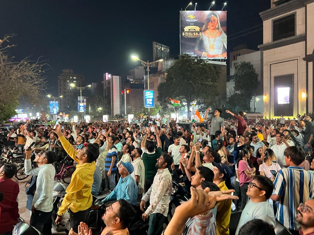 ચેમ્પિયન ટ્રોફિમાં ભારતીય ક્રિકેટ ટીમ 12 વર્ષ પછી ચેમ્પિયન બનતા રાજકોટ સહિત ગુજરાતભરમાં ક્રિકેટ પ્રેમીઓએ મોડી રાત સુધી જશ્ન મનાવ્યો હતો. રાજકોટના રેસકોર્સ રિંગરોડ-કાલાવડ રોડ-યાજ્ઞિક રોડ સહિતના વિસ્તારોમાં ક્રિકેટ રસિયાઓ હાથમાં તિરંગા લઈ વાહનોમાં નીકળી પડ્યા હતા અને નાચગાન સાથે આતશબાજી કરી ખુશી વ્યક્ત કરી હતી. આ ઉજવણીના કારણે ઠેર ઠેર ટ્રાફિક જામ થઈ ગયો હતો ભારત માતા કી જયના નારાથી વાતાવરણ ગુંજી ઉઠ્યુ હતું. (તસવીર : મુકેશ રાઠોડ)