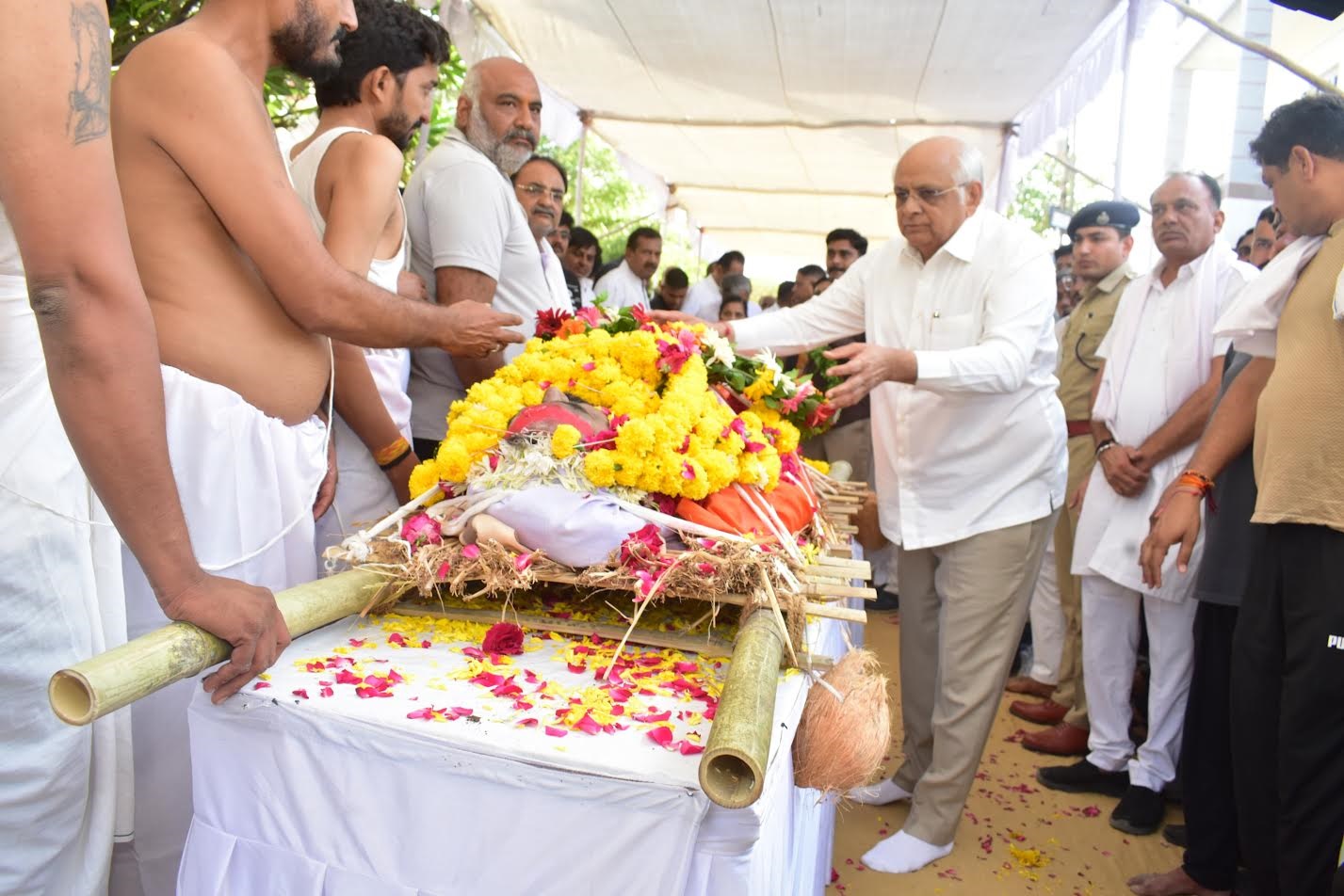 મુખ્યમંત્રીની સાથે કેન્દ્રિય રાજય મંત્રી નિમુબેન બાંભણીયા, કેબિનેટ મંત્રી કુંવરજીભાઇ બાવળીયા, મેયર ભરતભાઈ બારડ, ધારાસભ્યો સર્વ જીતુભાઈ વાઘાણી, સેજલબેન પંડ્યા, ભીખાભાઈ બારૈયા, ગૌતમભાઈ ચૌહાણ, જિલ્લા કલેકટર ડો. મનોજકુમાર બંસલ, જિલ્લા વિકાસ અધિકારી હનુલ ચૌધરી, રેન્જ આઇ.જી ગૌતમ પરમાર સહિતના અગ્રણીઓએ મૃતક પિતા-પુત્રને શ્રદ્ધાંજલિ અર્પણ કરી આ દુ:ખની ઘડીમાં સહભાગી બન્યા હતા.