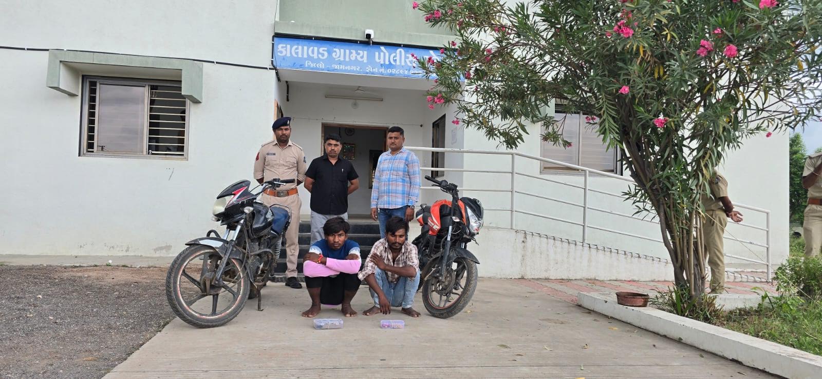 અને તપાસ કરવામાં આવી હતી.જેમાં પરપ્રાંતીય મજુરોની ગેંગ મંદીર ચોરીઓ કરતા હોવાનું તપાસ માં ખુલવા પામ્યું હતું. પોલીસને મળેલ બાતમીના આધારે કાલાવડ તાલુકાના મોટા વડાળાગામના પાટીયા પાસે કાલાવડ ગ્રામ્ય પોલીસ સ્ટાફ દ્વારા વોચ રાખીને બે આરોપીઓને મોટરસાઇકલ તથા ચોરી કરવાના સાધનો સાથે પકડી પાડવામાં આવ્યા હતાં અને તેની અટક કરવામાં આવી હતી. બન્ને આરોપીઓની પુછપરછ કરતા વધુ એક કાયદાથી સંઘર્ષીત કીશોર સડોવાયેલ હોવાનું જણાઇ આવતા તેને પણ પો.સ્ટે લાવી પુછપરછ કરી ચોરીમાં તેના ભાગમાં આવેલ રોકડ રકમ તથા મોબાઈલ કબ્જે કરવામાં આવેલ છે.