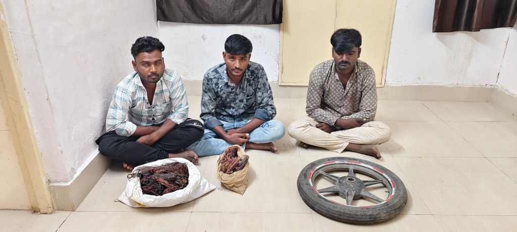 રાજકોટ જીલ્લામાં છેલ્લા ર મહિનામાં વાડી વિસ્તારમાં કેબલ વાયર ચોરીના બનાવો બન્યા હોય આ મામલે ગ્રામ્ય એલસીબીના પીઆઇ વી. વી. ઓડેદરા અને તેમની ટીમે આ ચોરીમાં સંડોવાયેલ ત્રીપુટીને વીરપુરના થોરાળા ગામની સીમમાંથી ઝડપી લીધા હતા. રાજકોટના જંગલેશ્ર્વરમાં રહેતા અમિત ભુપતભાઇ ડાભી તથા ભુપત ભનુભાઇ સોલંકી અને વાંકાનેરના પરેશ ભનુ સોલંકીની ધરપકડ કરી મોટર સાયકલના મેગવીલ અને કોપર વાયર કબજે કર્યો હતો. આ ત્રીપુટીએ છેલ્લા બે મહીનામાં અલગ અલગ 6 સ્થળોએ વાડી વિસ્તારમાં કોપર વાયર અને મોટર સાયકલની ચોરી કરી હતી.