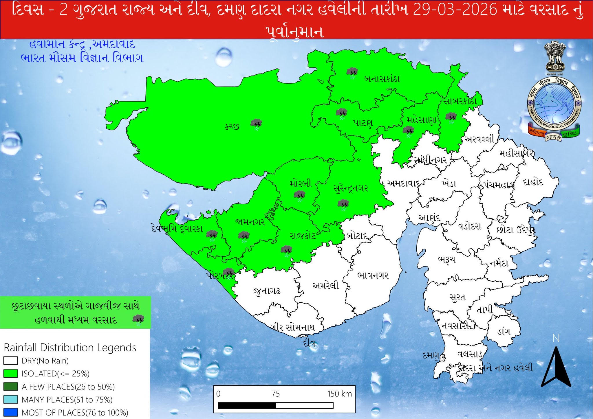 IMDના બુલેટિન મુજબ, 29 માર્ચ (દિવસ-3)ના રોજ ઉત્તર ગુજરાતના બનાસકાંઠા જિલ્લામાં કચ્છમાં તેમજ દ્વારકા, જામનગર, મોરબી, રાજકોટ, સુરેન્દ્રનગર, પાટણ, મહેસાણા, સાબરકાંઠા વગેરે વિસ્તૃત સ્થળોએ હળવો વરસાદ/વીજળી સાથે વરસાદની સંભાવના છે. સાથે જ 30-40 કિમી પ્રતિ કલાકની ઝડપે પવન ફૂંકાઈ શકે છે.30 માર્ચના રોજ આ સંભાવના વધીને બનાસકાંઠા, પાટણ, સાબરકાંઠા, અરવલ્લી, દાહોદ, રાજકોટ અને મહિસાગર જિલ્લાઓમાં ફેલાઈ શકે છે, સાથે કચ્છમાં પણ હળવો વરસાદ પડી શકે છે.