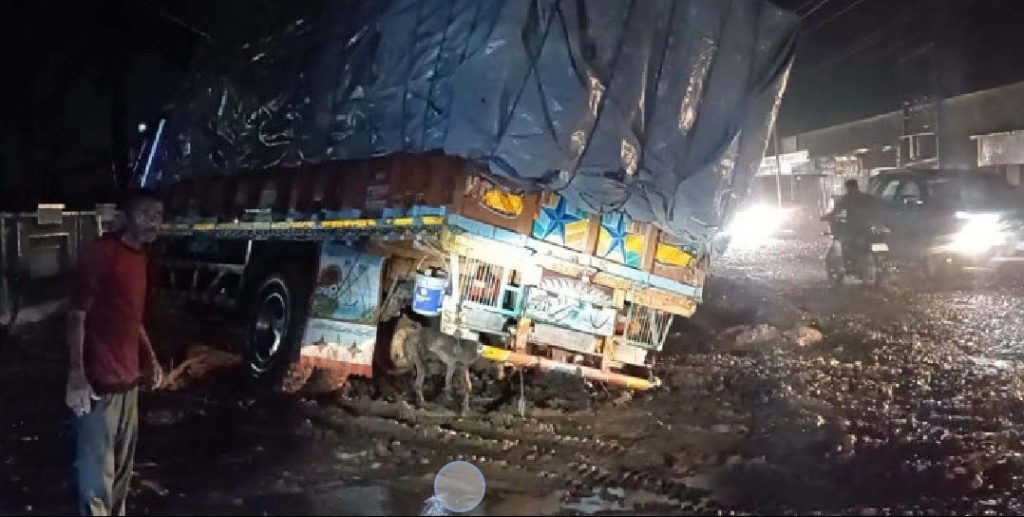 ધોરાજીમાં પ્રથમ વરસાદમાં જ માર્ગો પર પડેલા ગાબડામાં વાહનો ખુંચવા લાગ્યા છે જેમાં જુનાગઢ રોડ પર રેલ્વે ફાટક પછી પડેલા ખાડામાં ટ્રક ફસાયો હતો જેના કારણે આ રોડ ઉપર ટ્રાફિકને અસર થવા પામી હતી. (તસવીર : રમણીક ભાઈ ટોપીયા)