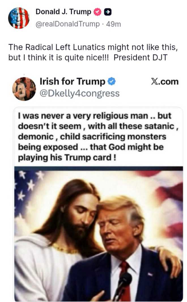 આ એકાઉન્ટે આ તસવીર પોસ્ટ કરી હતી જેમાં લખ્યું હતું કે “હું ક્યારેય ખૂબ ધાર્મિક માણસ નહોતો.. પણ એવું નથી લાગતું કે આ બધા શેતાની, બાળકોનું બલિદાન આપતા રાક્ષસોનો પર્દાફાશ થયો છે… કે ભગવાન કદાચ ટ્રમ્પ કાર્ડ રમી રહ્યા છે!”. આ પોસ્ટ તાજેતરના વિવાદ પછી થઈ હતી જ્યાં ટ્રમ્પે એક અલગ એઆઇ છબી શેર કરવા બદલ (અને ત્યારબાદ 13 કલાક પછી કાઢી નાખવામાં આવી હતી) ટીકાઓનો સામનો કરવો પડ્યો હતો જેમાં તેમને પાપલ ઝભ્ભામાં બીમાર વ્યક્તિને સાજા કરતા દર્શાવવામાં આવ્યા હતા.