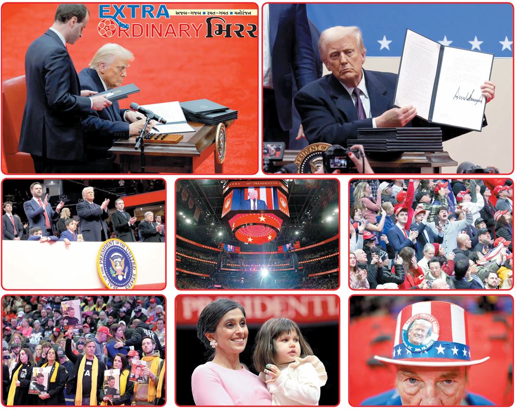 અમેરિકાના પ્રમુખપદે કડકડતી ઠંડી વચ્ચે ડોનાલ્ડ ટ્રમ્પ શપથ લીધા હતા. આ ભવ્ય અને ગૌરવપૂર્ણ કાર્યક્રમની તસવીરી ઝલકમાં રાષ્ટ્રગીત દરમ્યાન ઓનર આપતા લોકો, પ્રથમ મહિલા મેલાનિયા ટ્રમ્પ કેપિટલ વન અરેના ખાતે પહોંચ્યા તે દ્દશ્ય, એક્ઝિકયુટીવ ઓર્ડર પર હસ્તાક્ષર કરતા ટ્રમ્પ તથા આ અવસરે ઉમટેલો માનવસમુદાય નજરે પડે છે.