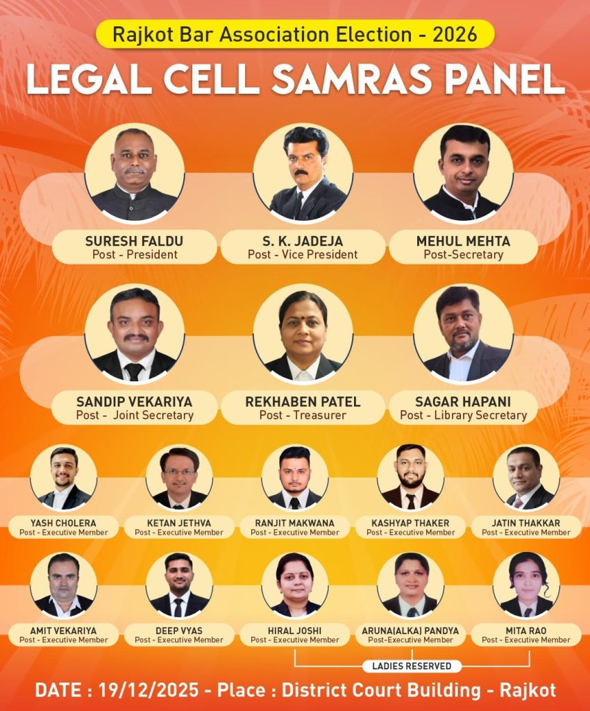 રાજકોટ બાર એશોસીએશનની આગામી તા.19/12/2025 ના રોજ ચુંટણીમાં ભાજપ લીગલ સેલની સમરસ પેનલના ઉમેદવારો આવતી કાલે સિનિયર જુનીયર વકીલો અને ટેકેદારોની હાજરીમાં વિજય મુહર્તમાં ઉમેદવારી નોંધાવશે.