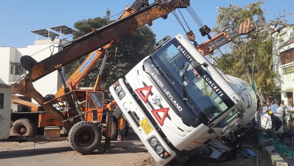 આજે સવારે બનેલા આ બનાવ ની પ્રાપ્ત થતી માહિતી મુજબ ભાવનગર શહેરના ઘોઘા સર્કલ લીંબડીયું વિસ્તારમાં દામાભાઈ ની હોટલ ની સામે બની રહેલ બાંધકામની સાઈટ પર આર એમ સી નો ટ્રક નંબર લષ 03 બીજ 3633 પલટી મારી જતા ખાડામાં પડ્યો હતો.