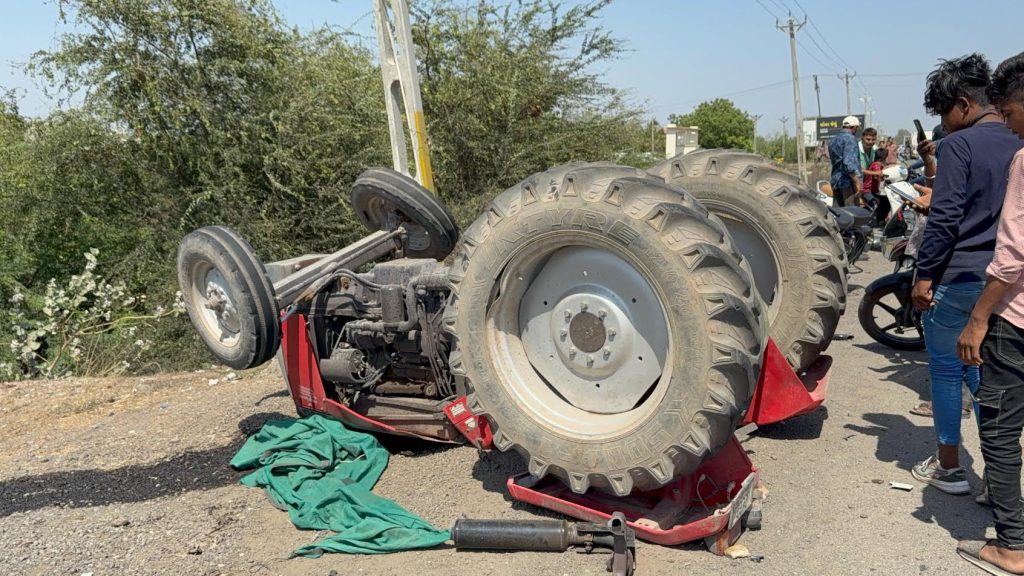 જામનગર નજીક નાઘેડી ગામના પાટીયા પાસે હાઈવે રોડ પર પુરપાટ ઝડપે આવી રહેલી રેન્જ રોવર કાર આગળ જઈ રહેલા એક ટ્રેક્ટર સાથે ટકરાઈ હતી, અને ટ્રેક્ટર ના બે ટુકડા થઈ ગયા હતા.