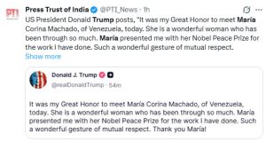 આ બહુચર્ચિત બેઠક ગુરુવારે વ્હાઇટ હાઉસમાં લંચ પર યોજાઈ હતી, જે આ મહિનાની શરૂઆતમાં અમેરિકાની આગેવાની હેઠળના ઓપરેશનમાં પૂર્વ પ્રમુખ નિકોલસ માદુરોની ધરપકડ બાદ થઈ છે. એક કલાકથી વધુ ચાલેલી ચર્ચા બાદ જ્યારે મચાડો વ્હાઇટ હાઉસમાંથી બહાર નીકળ્યા, ત્યારે તેમના સમર્થકોએ તેમનું ઉષ્માભર્યું સ્વાગત કર્યું હતું. તેમણે સમર્થકોને કહ્યું, “આપણે પ્રમુખ ટ્રમ્પ પર વિશ્વાસ કરી શકીએ છીએ.” કેટલાક લોકોએ “આભાર, ટ્રમ્પ,” ના નારા લગાવ્યા અને પછી વોશિંગ્ટનમાં અન્ય બેઠકો માટે રવાના થયા.