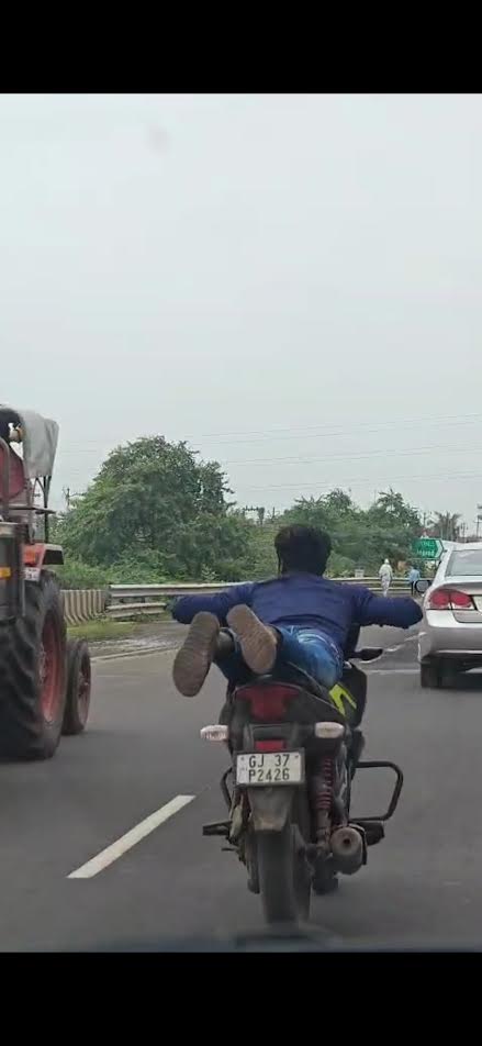 ગઈકાલે રવિવારના દિવસે વરસાદી વાતાવરણની વચ્ચે એક બાઈક ચાલક સ્ટંટ કરતાં જોવા મળ્યો હતો. જામનગર થી જોગવડ તરફ જવાના માર્ગે બાઈક સવાર પોતાના બાઈકમાં સુતા સુતા ફૂલ સ્પીડમાં પોતાનું વાહન ચલાવતાં જોવા મળ્યો હતો, એટલું જ માત્ર નહીં તેની પાછળ કારમાં આવી રહેલો એક શખ્સ તેનો વિડીયો પણ બનાવી રહ્યો હતો, અને તે વિડિયો ગઈકાલે દિવસ દરમિયાન સોશિયલ મીડિયામાં ફરતો થયો હતો. જેથી પોલીસ તંત્ર સતર્ક બન્યું છે, અને આવા બાઈકર્સને શોધી રહ્યું છે. હાઈવે રોડ પર ભારે વાહનોની અવર-જવરની વચ્ચે આવા સ્ટંટબાજો અકસ્માત નોતરે તેવી પરિસ્થિતિમાં અને જોખમ ભરી રીતે બાઈક ચલાવતા હોવાથી અન્ય વાહનચાલકોને પણ ભયમાં મૂકી દે તેવી પરિસ્થિતિ સર્જતા હોય છે.