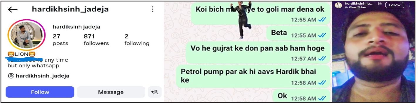 રાજદિપસિંહ ને ઉદેશી ને વધુ માં કહ્યુ કે હું અસલી ગરાસીયો છુ.એટલે તારા ઘર પર ફાયરીંગ નથી કર્યા મેં જ પેટ્રોલ પંપ ઉપર છોકરાઓ મોકલી ફાયરીંગ કરાવ્યાં નું જણાવ્યું છે. હાર્દિકસિંહ નામના યુવકનો વીડિયો વાઇરલ આ મામલામાં ત્યારે મોટો વળાંક આવ્યો, જ્યારે હાર્દિકસિંહ જાડેજા નામના ઇન્સ્ટાગ્રામ એકાઉન્ટ પરથી ચાર જેટલા વીડિયોની સ્ટોરી મૂકવામાં આવી.આ વીડિયોમાં હાર્દિકસિંહ પોતે જ ફાયરિંગ કર્યું હોવાનો દાવો કરી રહ્યો છે અને રાજદીપસિંહ જાડેજાને ખુલ્લી ધમકી પણ આપી રહ્યો છે. વાયરલ થયેલા આ વીડિયોમાં હાર્દિકસિંહ બેફામ વાણી વર્તન કરતા જોવા મળી રહ્યો છે, જેનાથી આ મામલો વધુ ગંભીર બન્યો છે. હાર્દિકસિંહ જાડેજા નામના ઇન્સ્ટાગ્રામ એકાઉન્ટમાં સ્ટોરી મૂકી છે, જેમાં હાર્દિકસિંહ નામના વ્યક્તિએ ફાયરીંગ કર્યું હોવાનું જાણવા મળી રહ્યું છે.
