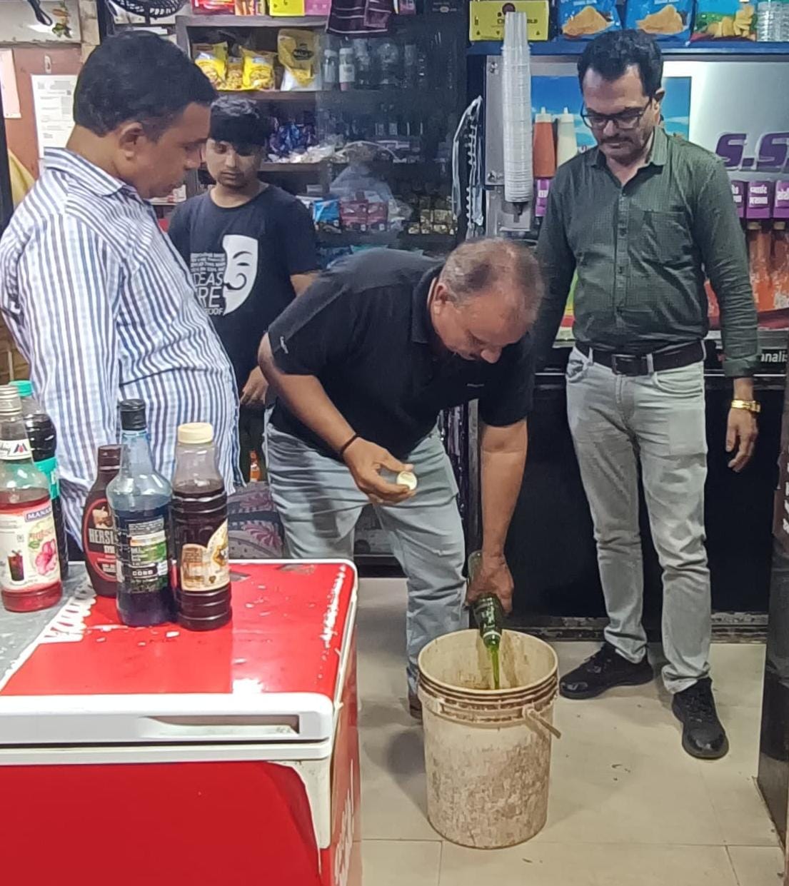 ફૂડ વિભાગ દ્વારા જુલેલાલ પાન કોલ્ડ્રિંક્સ જ્યુસ” પેઢીની તપાસ કરતા સ્થળ પર પેઢીમાં સંગ્રહ કરેલ 11 લિટર સરબત બોટલ તથા ઠંડાપીણાં એક્સપાયરી ડેટ વીતેલ માલૂમ પડતાં સદર જથ્થાનો સ્થળ પર નાશ કરવામાં આવેલ તેમજ પેઢીને સ્થળ પર હાઈજેનિક કન્ડિશન, યોગ્ય સ્ટોરેજ જાળવવા તથા લાયસન્સ બાબતે નોટીસ આપવામાં આવેલ તેમજ એ.જી. ચોક-પ્રેમ મંદિર સામે હોકર્સ ઝોન તથા ભગતસિંહ ગાર્ડન સામે આવેલ વિસ્તારમાં ખાધ્યચીજોનું વેચાણ કરતાં કુલ 20 ધંધાર્થિઓની ચકાસણી હાથ ધરવામાં આવેલ.