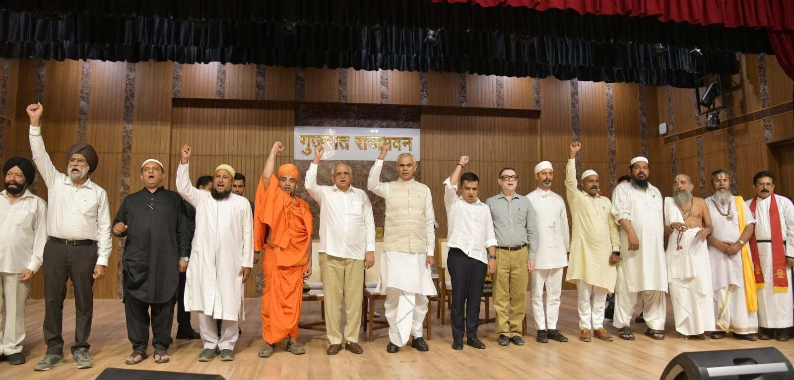 રાજ્યપાલ, મુખ્યમંત્રી, રાજ્યગૃહમંત્રીની હાજરીમાં વિવિધ ધર્મના વડાઓ, ગુરુઓ અને અગ્રણીની સભામાં સરકારની કાર્યવાહીના સમર્થનમાં સૂર વહ્યા