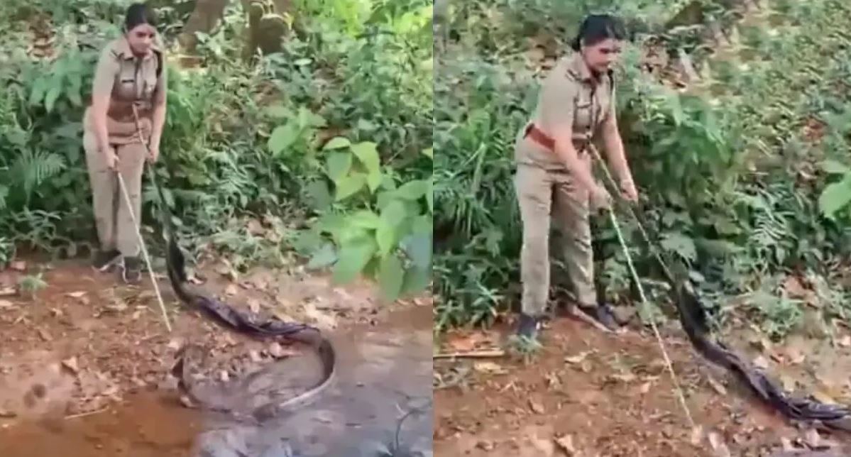 કેરળનો એક ચોંકાવનારો અને હૃદયસ્પર્શી વીડિયો સોશિયલ મીડિયા પર વધુને વધુ વાયરલ થઈ રહ્યો છે. આ વીડિયોમાં ફોરેસ્ટ બીટ ઓફિસર જી.એસ. રોશની બહાદુરીથી એક વિશાળ કિંગ કોબ્રાને બચાવતા જોઈ શકાય છે. આ વીડિયો નિવૃત્ત વન અધિકારી સુશાંત નંદાએ શેર કર્યો છે. વીડિયોમાં જોઈ શકાય છે કે રોશની છીછરા પ્રવાહમાં સાપ પકડતી લાકડીની મદદથી ખૂબ જ કુશળતાથી સાપને સંભાળે છે.