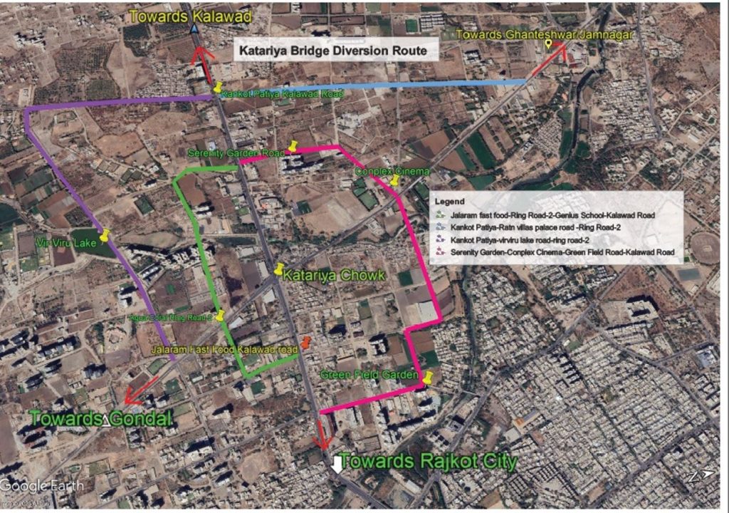 (આવવા તથા જવા માટે) – (ભારે તથા ઇન્ડસ્ટ્રીયલ વાહન માટે)150 ફુટ રીંગ રોડ-ર થી રત્નવિલાસ પેલેસવાળા રસ્તા થઇ કાલાવડ રોડ – કણકોટ ચોકડી થી વિર-વિરૂૂ તળાવર4.00મીટરવાળા રસ્તે થઇ 150 ફુટ રીંગ રોડ-ર તરફ જવાશે.