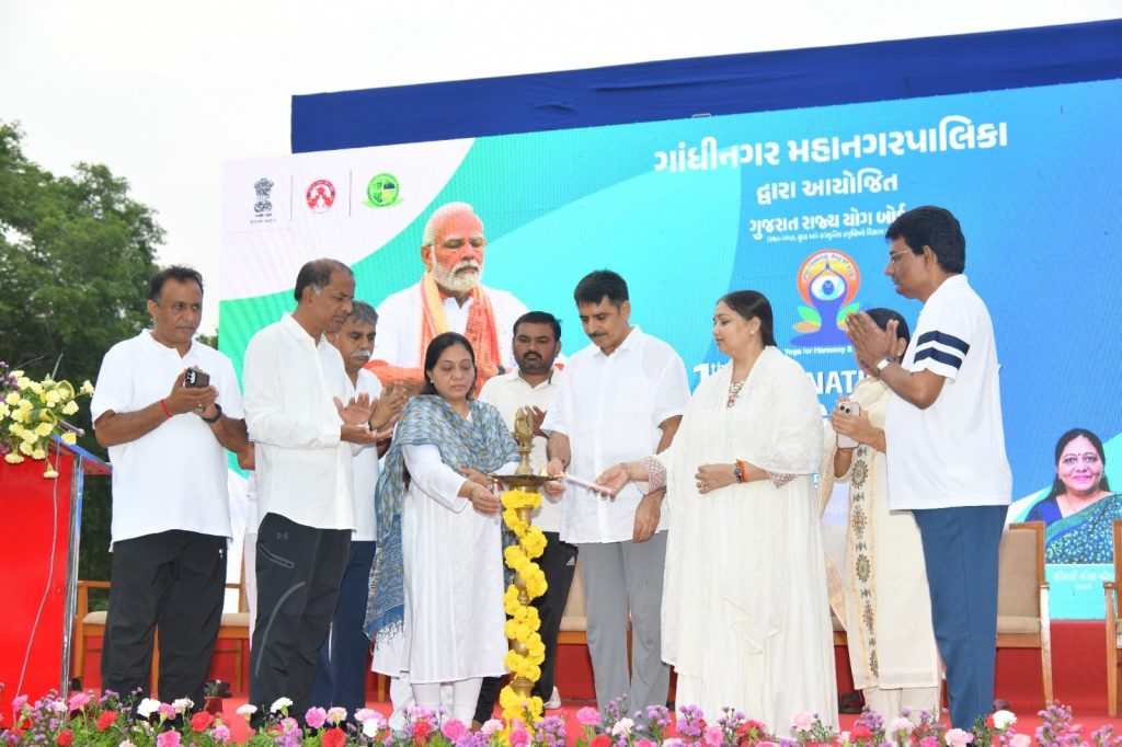 આજે ગાંધીનગરના સેન્ટ્રલ વિસ્ટા ગાર્ડન ખાતે ગુજરાત વિધાનસભાના અધ્યક્ષ શંકરભાઈ ચૌધરીની અધ્યક્ષતામાં અને મહિલા-બાળ કલ્યાણ મંત્રી ભાનુબેન બાબરીયાની ઉપસ્થિતિમાં 11માં આંતરરાષ્ટ્રીય યોગ દિવસની ઉત્સાહભેર ઉજવણી કરવામાં આવી હતી. ગુજરાત યોગ બોર્ડ અને ગાંધીનગર મહાનગરપાલિકાના સંયુક્ત ઉપક્રમે આયોજિત આ કાર્યક્રમમાં એક સાથે અંદાજે 3 હજાર જેટલા શહેરીજનોએ ભાગ લઈને વિવિધ યોગાભ્યાસ કર્યા હતા. આંતરરાષ્ટ્રીય યોગ દિવસ નિમિત્તે વડાપ્રધાન નરેન્દ્રભાઈ મોદીએ વિશાખાપટ્ટનમથી વર્ચ્યુઅલી સંબોધન કરી દેશવાસીઓને યોગદિનની શુભકામનાઓ પાઠવી હતી.