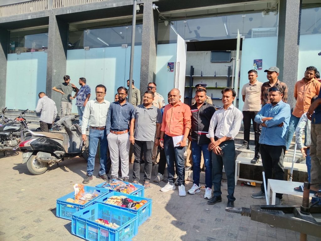 તેમજ ઓનલાઈન કમ્પ્લેઈન પણ નોંધાઈ હતી. ઓનલાઈન કમ્પ્લેઈન નોંધતા જ આરોગ્ય વિભાગની ટીમ હરકતમાં આવતા આર.કે. આઈકોનીક બીલ્ડીંગમાં આવેલ ઝેપ્ટો કંપની (ડ્રોગેરિયા સેલર પ્રા.લી.) ખાતે ટીમો પહોંચી હતી. અને સ્થળ પરથી 35 કિલો જેટલા નોનવેજ ખાદ્યચીજોને ખોલીને ટીપરવાન મારફતે સોખડા ડમ્પીંગ સાઈટમાં નાશ કરવા માટે મોકલી આપી હતી અને બીજી કાર્યવાહીમાં ઈન્ફીનીટી કોમ્પલેક્ષમાં સ્વીગીના વેરહાઉસમાં દરોડો પાડીને 60 કિલો જેટલા માસ અને ચિકનના જથ્થાનો નાશ કરવામા આવ્યો હતો. રાજકોટ મનપાના જાહેરનામાનો ભંગ કરનાર કંપનીઓને રોજકામ કરીને હજારો રૂપિયાનો વહીવટી દંડ ફટકારવામાં આવ્યો છે.